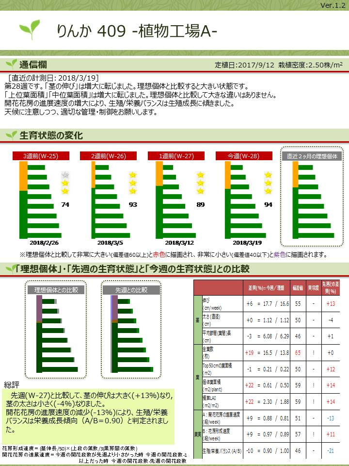 第28週です。「茎の伸び」は増大に転じました。理想個体と比較すると大きい状態です。「上位葉面積」「中位葉面積」は増大に転じました。理想個体と比較して大きな違いはありません。開花花房の進展速度の増大により、生殖/栄養バランスは生殖成長に傾きました。天候に注意しつつ、適切な管理・制御をお願いします。先週(W-27)と比較して、茎の伸びは大きく(+13%)なり,茎の太さは小さく(-4%)なりました。開花花房の進展速度の減少(-13%)により、生殖/栄養バランスは栄養成長傾向(A/B=0.90)と判定されました。